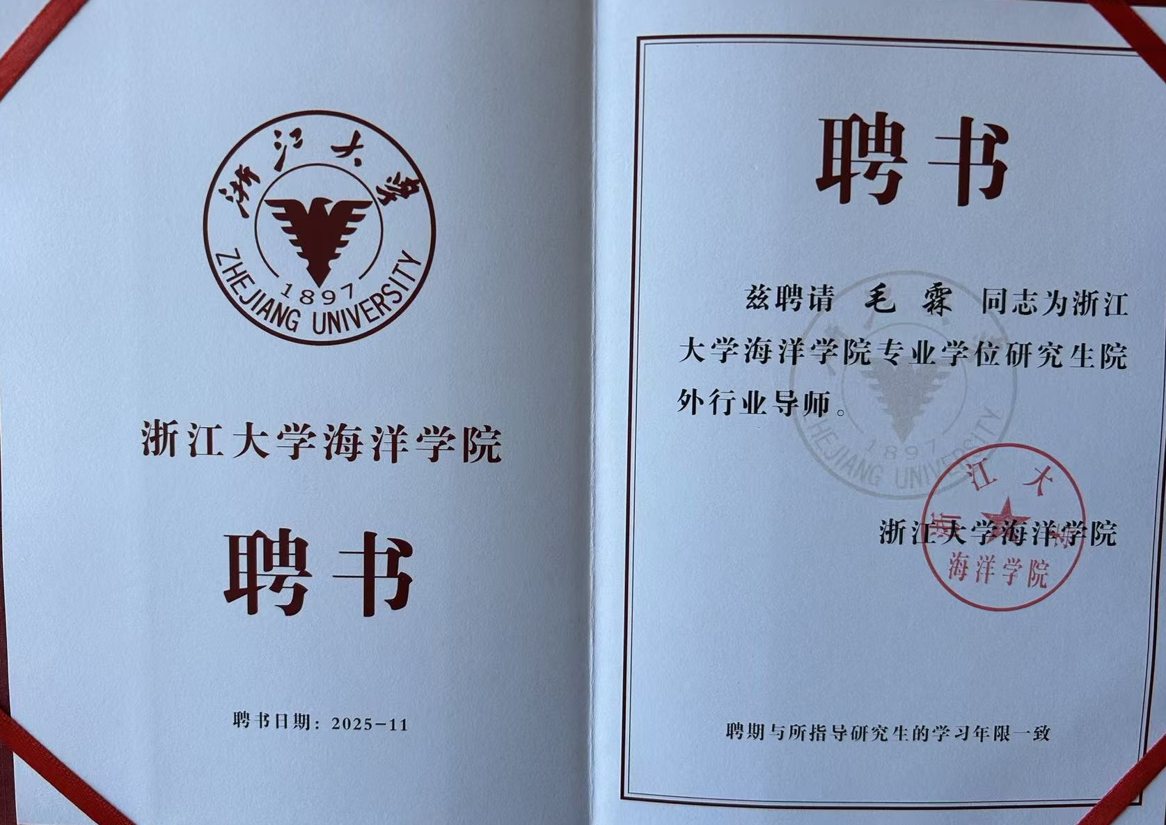 • 2026-03-13【聘書】浙江大學海洋學院專業學位研究生院外行業導師查看
