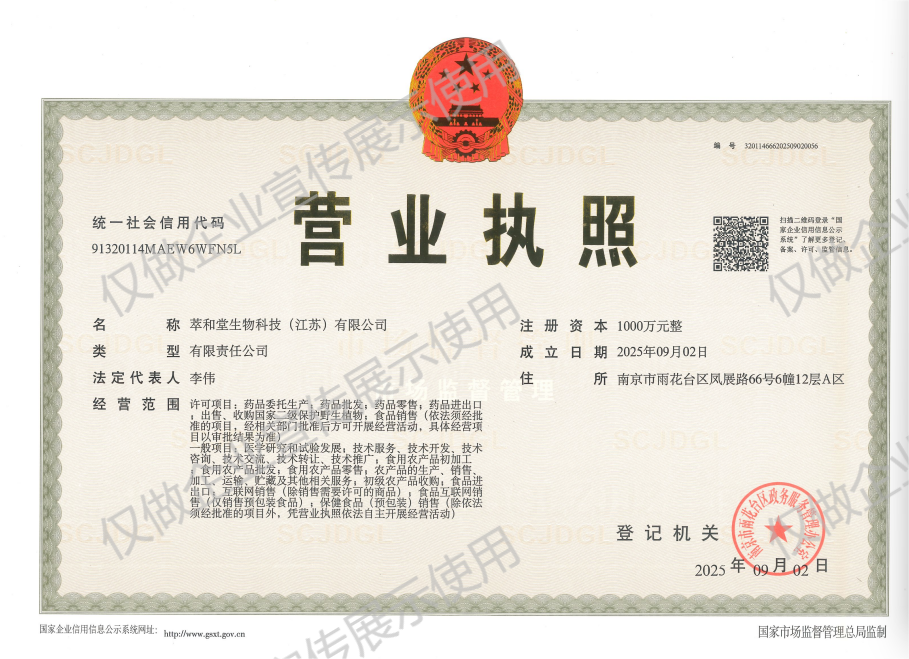 2025年9月2日,萃和堂生物科技(江蘇)有限公司(簡稱“萃和堂”)正式成立,統一社會信用代碼:91320114MAEW6WFN5L,注冊資本金1000萬元。由新立訊科技集團股份有限公司、北京金來順投資有限公司與遵義廖元和堂藥業有限公司按17:2:1聯合投資設立?!拜秃吞谩睂⒁劳星嗪J〉蔫坭?、蟲草、鹿茸、黃精等特色農產品資源,深度融合中華老字號“廖元和堂”與“中國非遺”發酵工藝飲片(含片)生產資質與成熟技術,從初加工農產品到精制加工的中藥飲片(含片)系列大健康消費品,助力“青貨出青”鄉村振興戰略。