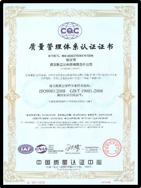 質量管理體系的建立和貫徹運行,將有助于新立訊完善管理流程,提高運營效率,也為進一步的市場開拓提供了強有力的支撐,同時綜合提升新立訊企業整體形象及核心競爭力。至此,新立訊企業主要經營項,均通過ISO質量體系認證。