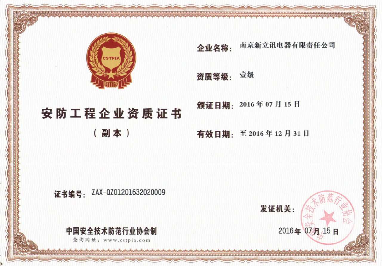 2015年7月,新立訊榮獲中國安全技術防范行業(yè)協(xié)會頒發(fā)的安防工程企業(yè)一級資質(zhì)證書,證書編號ZAX-QZ01201632020009,這不僅是公司在安防領域技術實力的體現(xiàn),同時獲得該證書也將進一步提升公司的知名度和影響力,增強公司的綜合競爭能力,為今后在安全技術防范領域業(yè)務市場的拓展奠定堅實基礎。