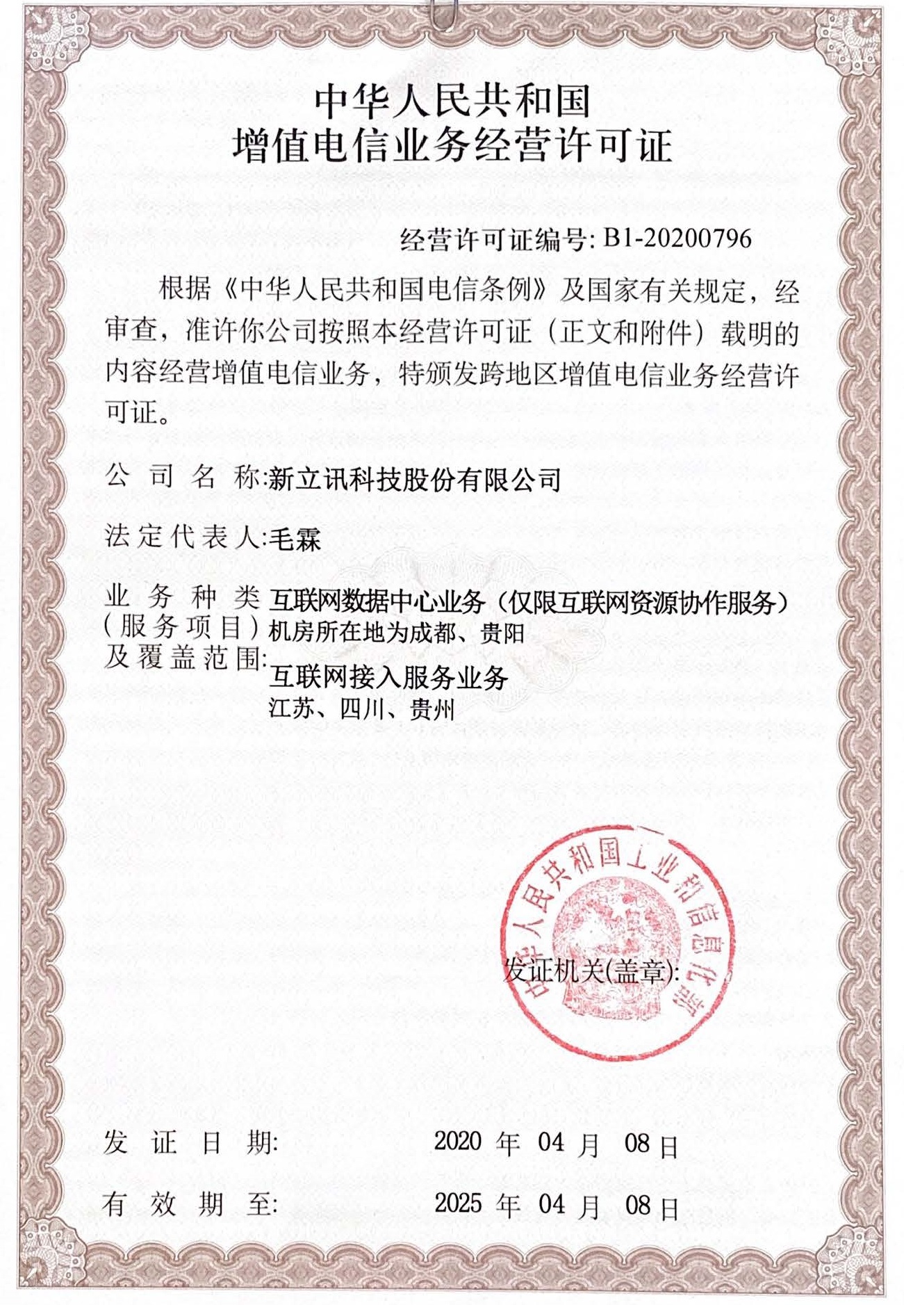 近期,新立訊獲頒工信部《中華人民共和國增值電信業務經營許可證》,獲準開展全國互聯網接入服務(ISP)業務和互聯網數據中心業務(IDC)(互聯網資源協作服務)。