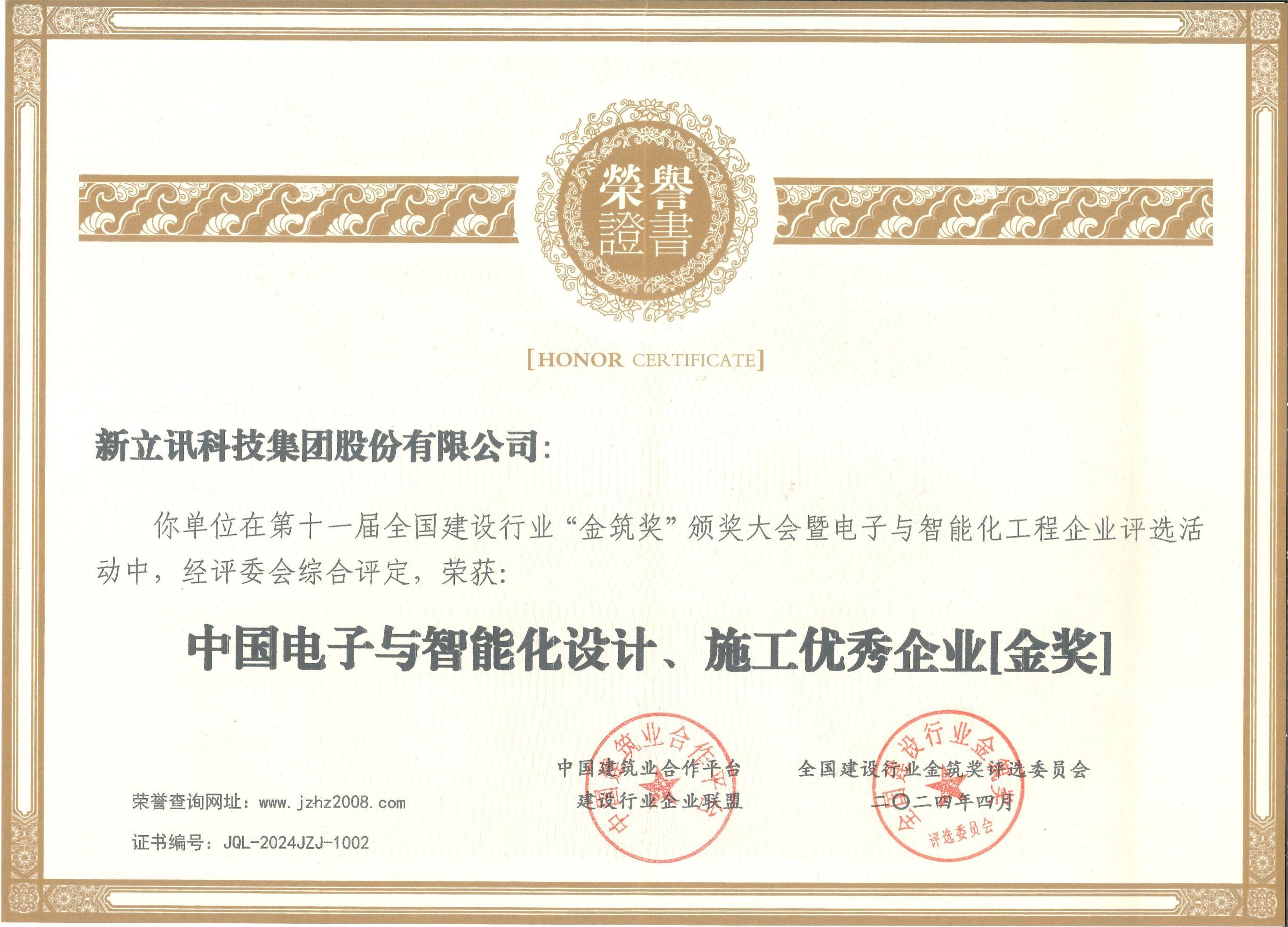 在近日舉行的第十一屆全國建設行業“金筑獎”評選活動中,新立訊科技集團獲榮獲“中國電子與智能化設計、施工優秀企業金獎”和“全國優質工程項目質量獎”雙項。全國建設行業“金筑獎”評選活動是國內建筑行業極具權威性和影響力的獎項之一。